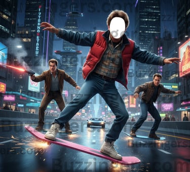Great Scott! 🛹 Travel through time in style as Marty McFly in the iconic hoverboard scene from Back to the Future Part II. Relive the 80s energy, futuristic vibes, and fearless attitude. Just share your photo on WhatsApp or email support@buzzingers.com, and choose this scene. Once your payment ($0.99) is complete, we’ll send back your personalized hoverboard image — cool, retro, and totally timeless. ⚡