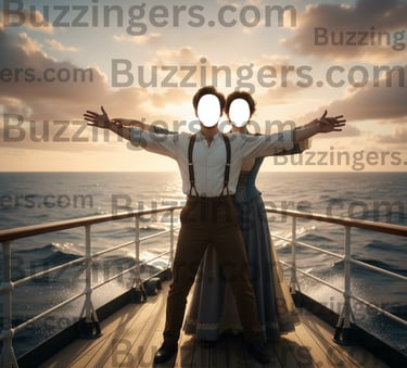 Feel the wind, the freedom, and the moment of pure joy! 🌊 Recreate the timeless “I’m the King of the World!” scene from Titanic (1997) and make it your own. Just share your photo on WhatsApp or email support@buzzingers.com, and choose this scene. After completing your payment ($0.99), we’ll send your personalized Titanic image — elegant, cinematic, and full of emotion. 🚢