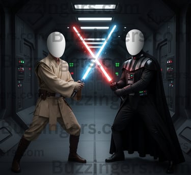 The Force is strong with this one. ⚔️ Step into the epic Star Wars universe and relive the legendary lightsaber duel between Jedi and Sith. Share your photo on WhatsApp or email support@buzzingers.com, and choose this scene. Once payment ($0.99) is complete, we’ll send back your personalized Star Wars image — powerful, cinematic, and ready for battle among the stars. 🌌